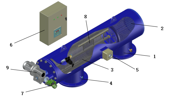 原水由進(jìn)水口(1)進(jìn)入過(guò)濾器,進(jìn)入粗濾網(wǎng)(2)過(guò)濾掉較大的顆粒狀雜質(zhì),過(guò)濾后進(jìn)入到精濾網(wǎng)(3),凈水由出水口(4)流出。此過(guò)程中,原水中的雜質(zhì)不斷在濾網(wǎng)表面積累。致使過(guò)濾器出、入口間形成了一個(gè)壓差△P,當(dāng)此壓差△P達(dá)到壓差控制器(5)預(yù)設(shè)值或電控箱(6)設(shè)置的時(shí)間值時(shí)。自動(dòng)清洗功能啟動(dòng),排污閥(7)開(kāi)啟,在過(guò)濾器內(nèi)壓力與對(duì)大氣的排污口間的壓差作用下,濾網(wǎng)表面的雜質(zhì)經(jīng)不銹鋼刷(8)對(duì)濾芯進(jìn)行清洗,雜質(zhì)由排污閥排出。在此過(guò)程中,由于電機(jī)(9)的作用使得不銹鋼刷在濾網(wǎng)表面做螺旋掃描,將整個(gè)濾網(wǎng)表面雜質(zhì)清洗干凈。清洗結(jié)束,排污閥關(guān)閉。一個(gè)清洗周期結(jié)束。